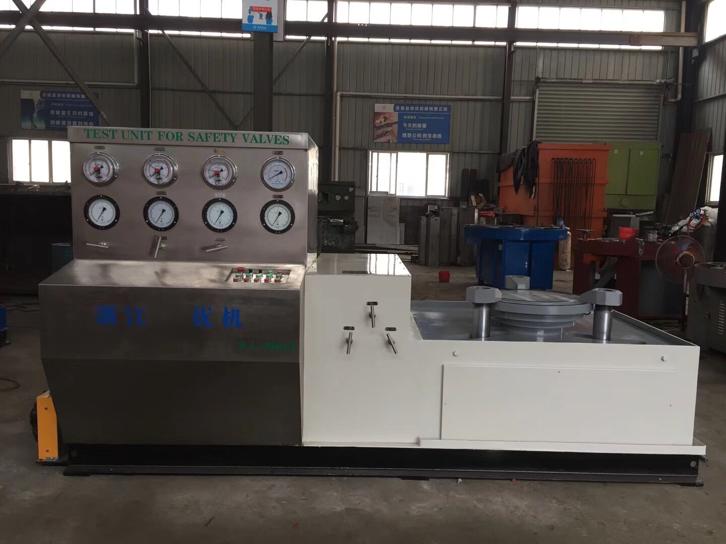 此次中標的產品是國家專利產品,公司擁有自主知識產權,專利號:ZL 2013 2 0894666.7,型號:JLA-Z-600精度智能安全閥測試機,該試驗設備精度可達到0.25%,分辨率0.01Mpa,過水部件和控制柜選用不銹鋼管路和高壓開關閥門,主要針對石化冶煉高要求大口徑安全閥。JLA-Z600試驗機具有結構簡潔、功能齊全、精度高、操作易懂等特點,主要測試檢驗安全閥起跳/整定/強度等性能參數檢測。是目前國內技術領先的智能安全閥試驗檢測設備,是浙江優(yōu)機機械公司自主研發(fā)的新一代大口徑安全閥檢測設備,該產品先后中標大慶油田建設工程公司、中海油大亞灣閥門檢測中心,產品憑借高精度、智能、節(jié)能、操作方便等特點是石油化工和金屬冶煉企業(yè)的首選產品。